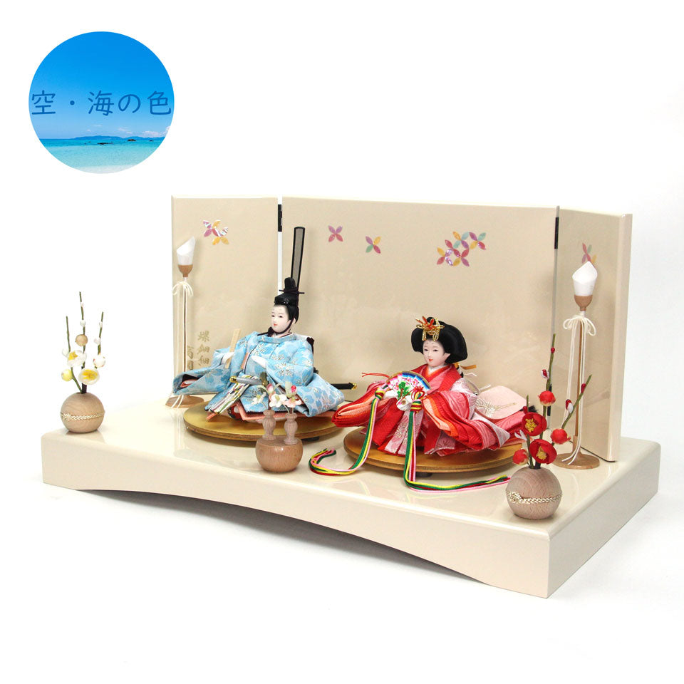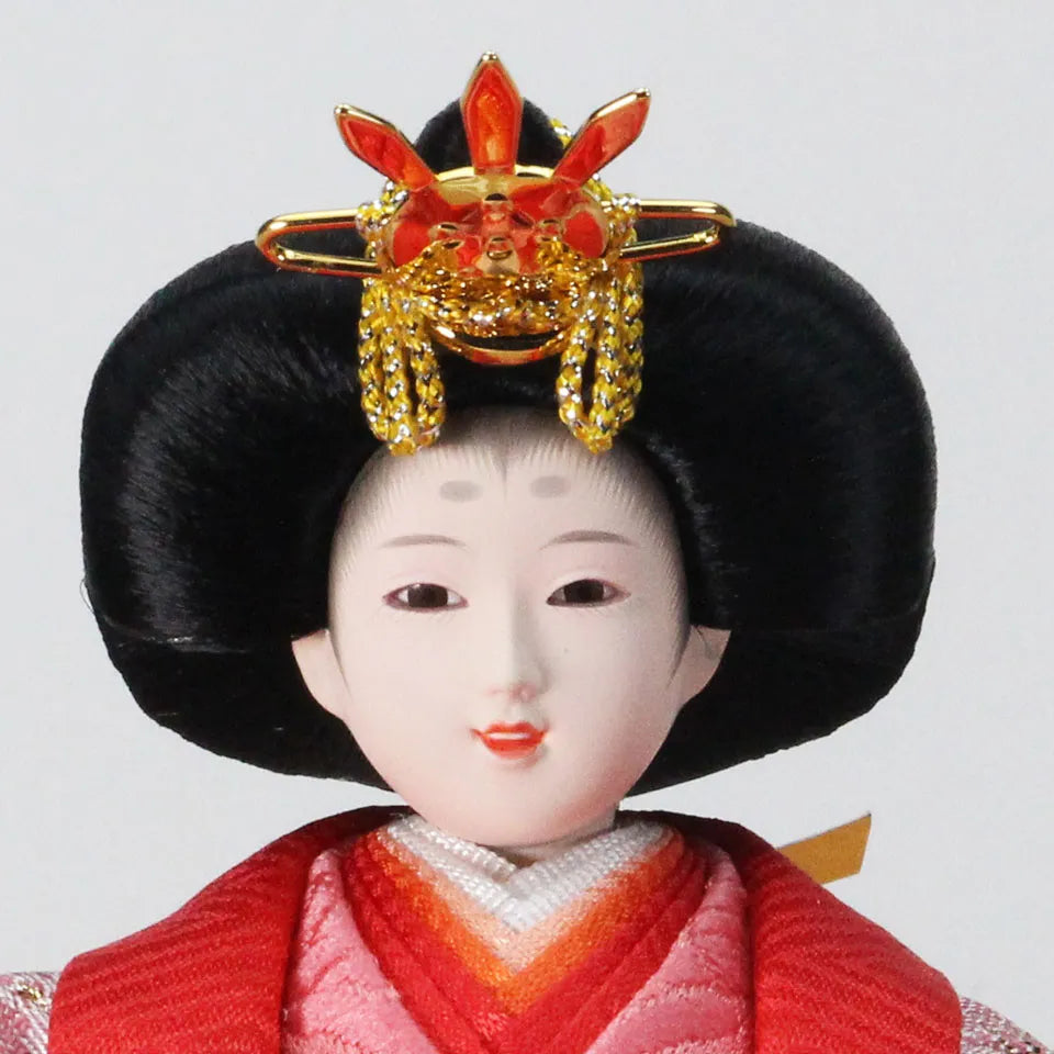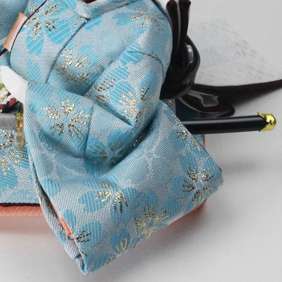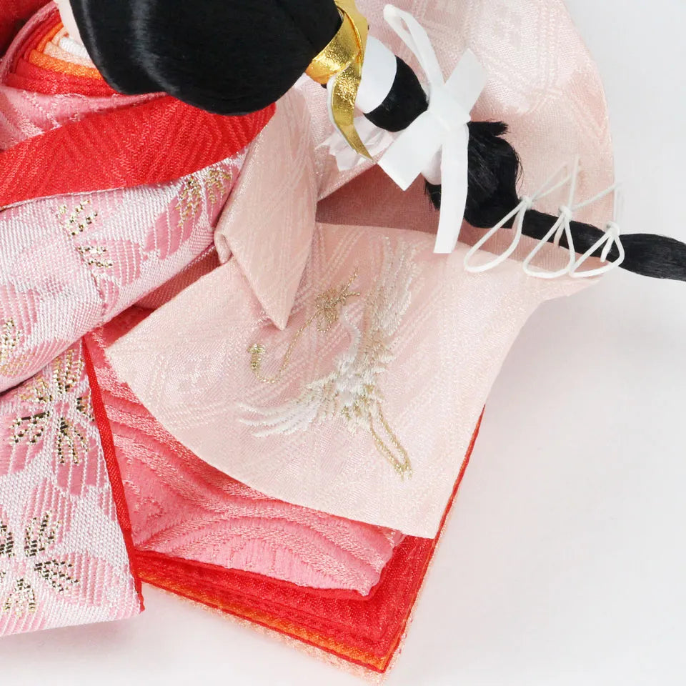 衣装の柄に大きな桜の花びら柄を使い裳には「子宝印」の鶴が刺繍されています。鶴が運ぶ金の糸(幸せ)を暖かい配色の雛人形が運びます。