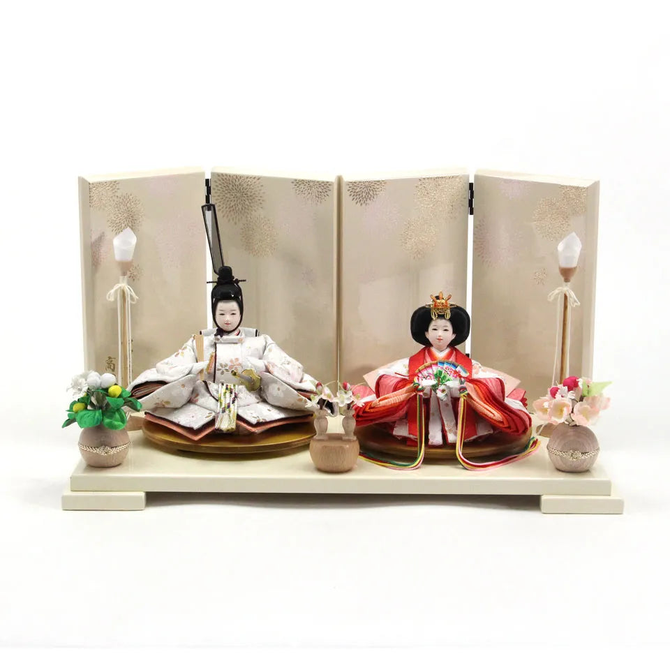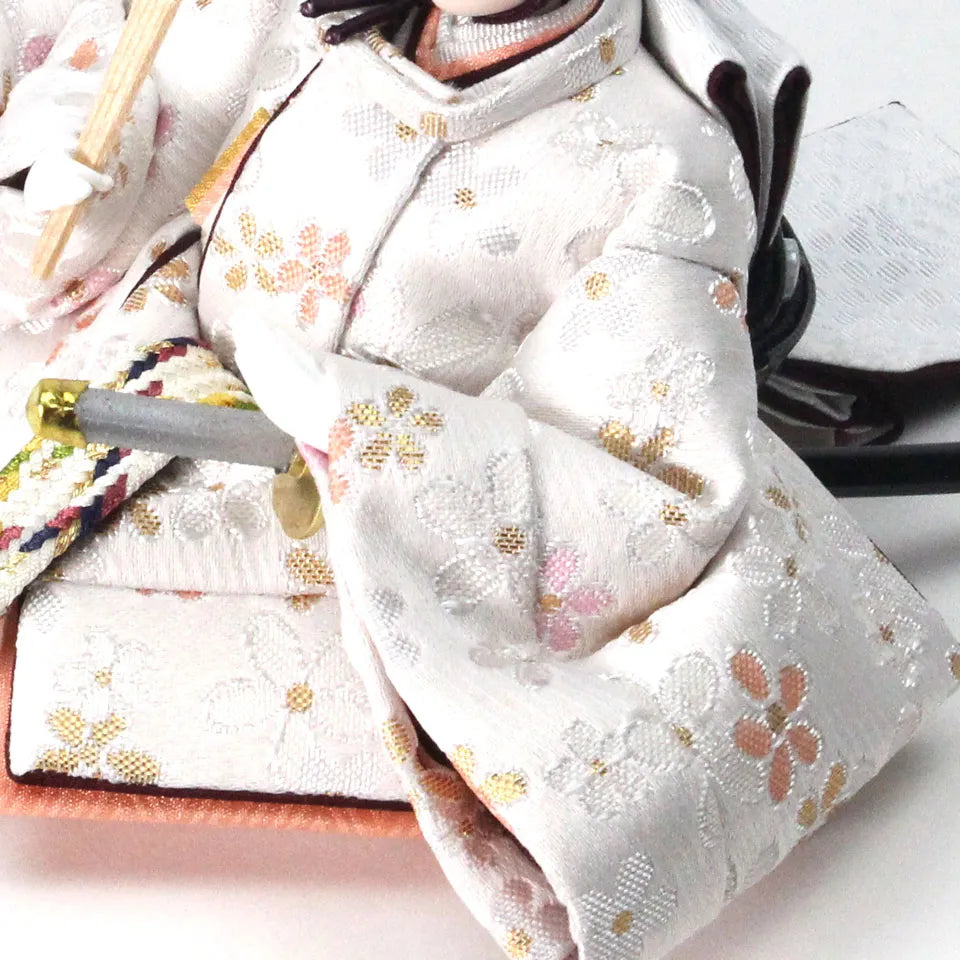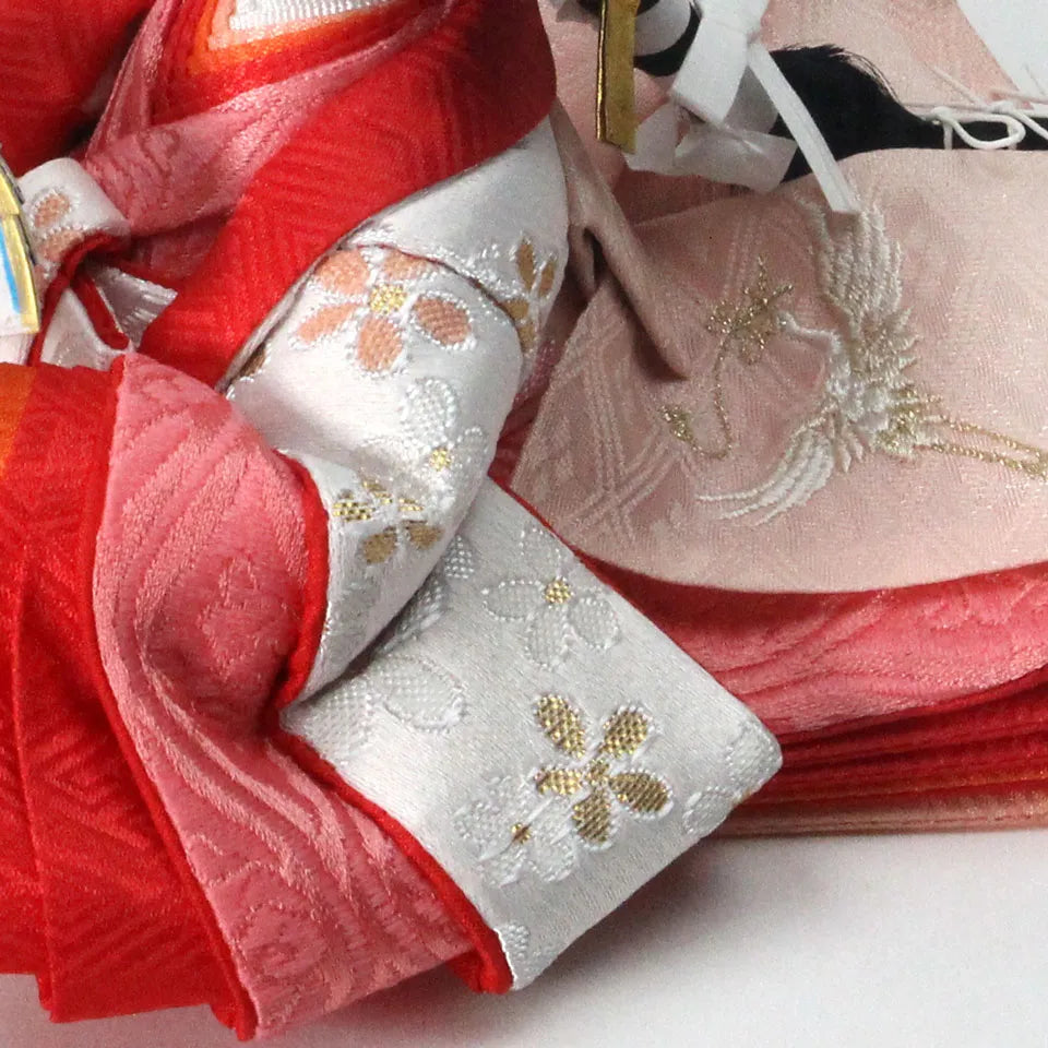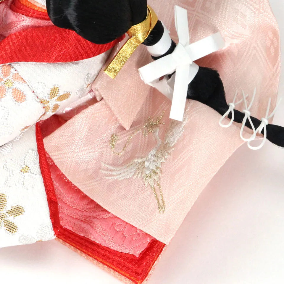 衣装の柄にはデフォルメされた可愛らしい桜の花びら柄を使い裳には「子宝印」の鶴が刺繍されています。鶴が運ぶ金の糸(幸せ)を暖かい配色の雛人形が運びます。