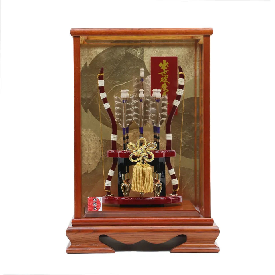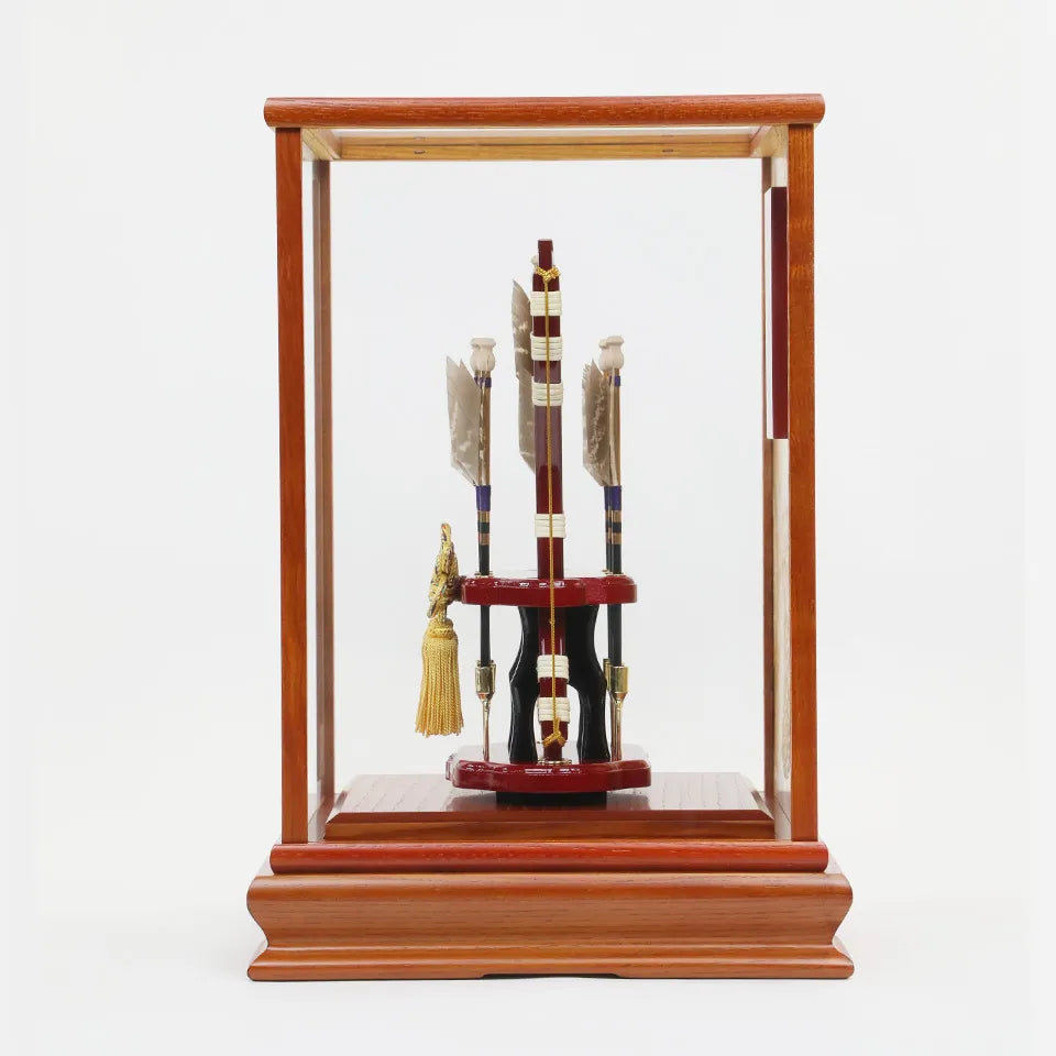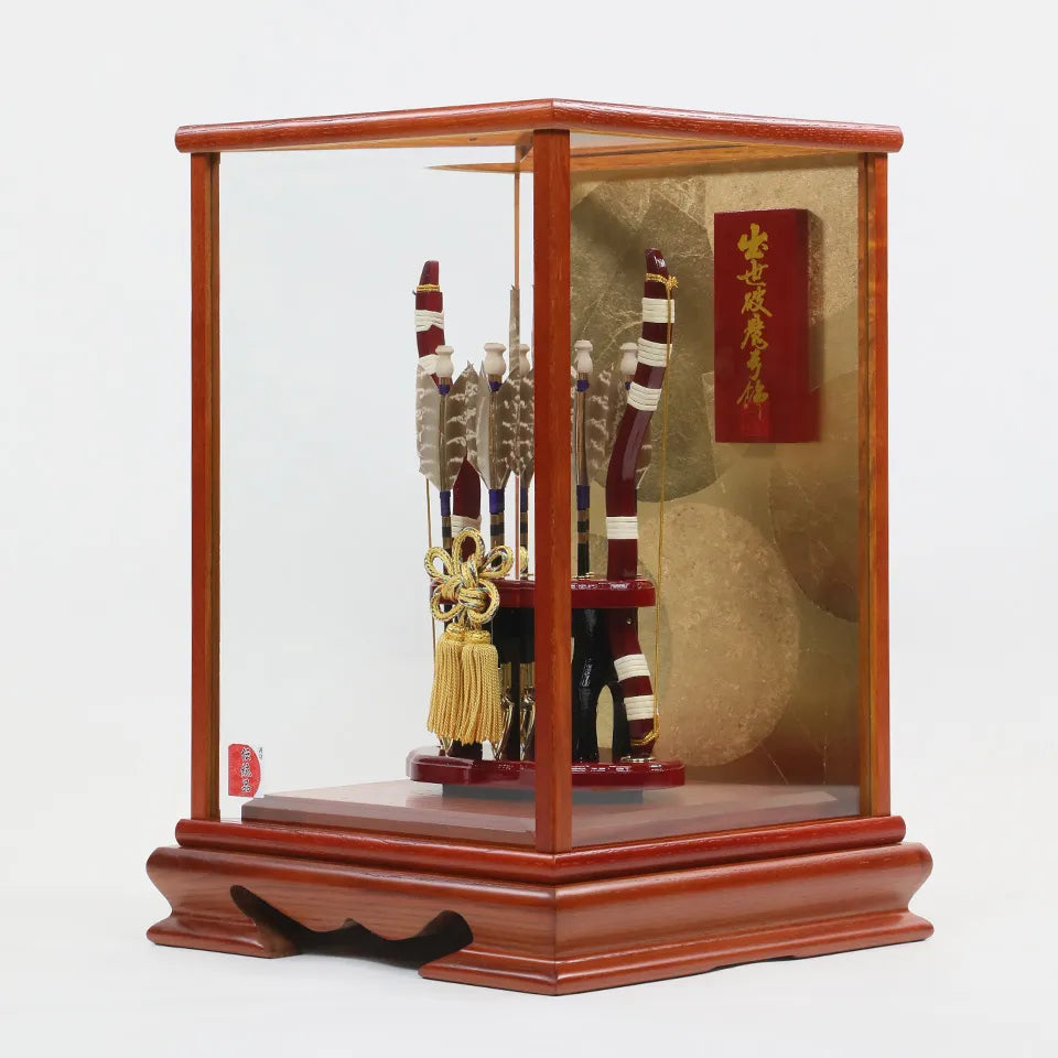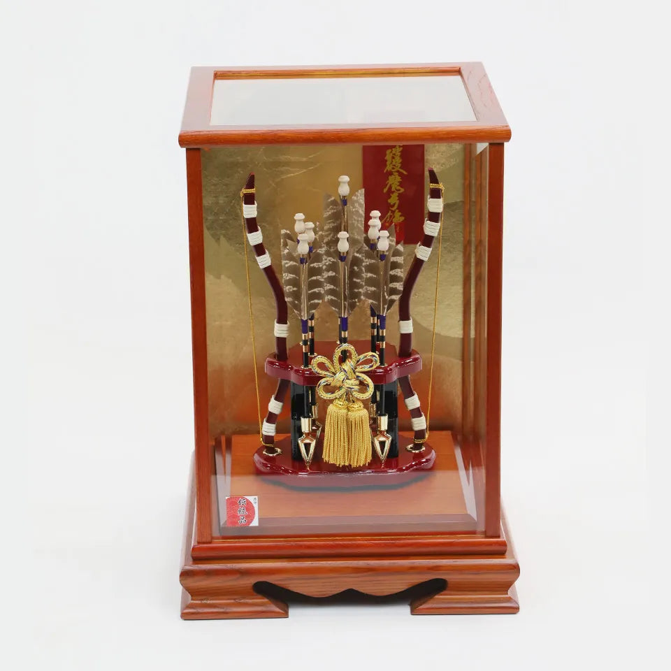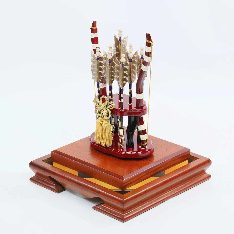 ケースは家具などに使われ木目の美しい栓(セン)の木材を使用しています。ケースの中の破魔弓本体は国宝 松江城所蔵の破魔弓をイメージしてデザインし、矢羽根は日本の国鳥キジの羽根を使用しています。