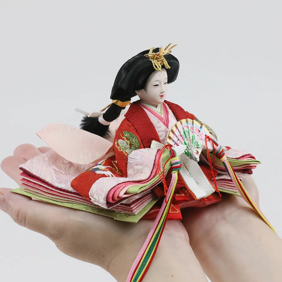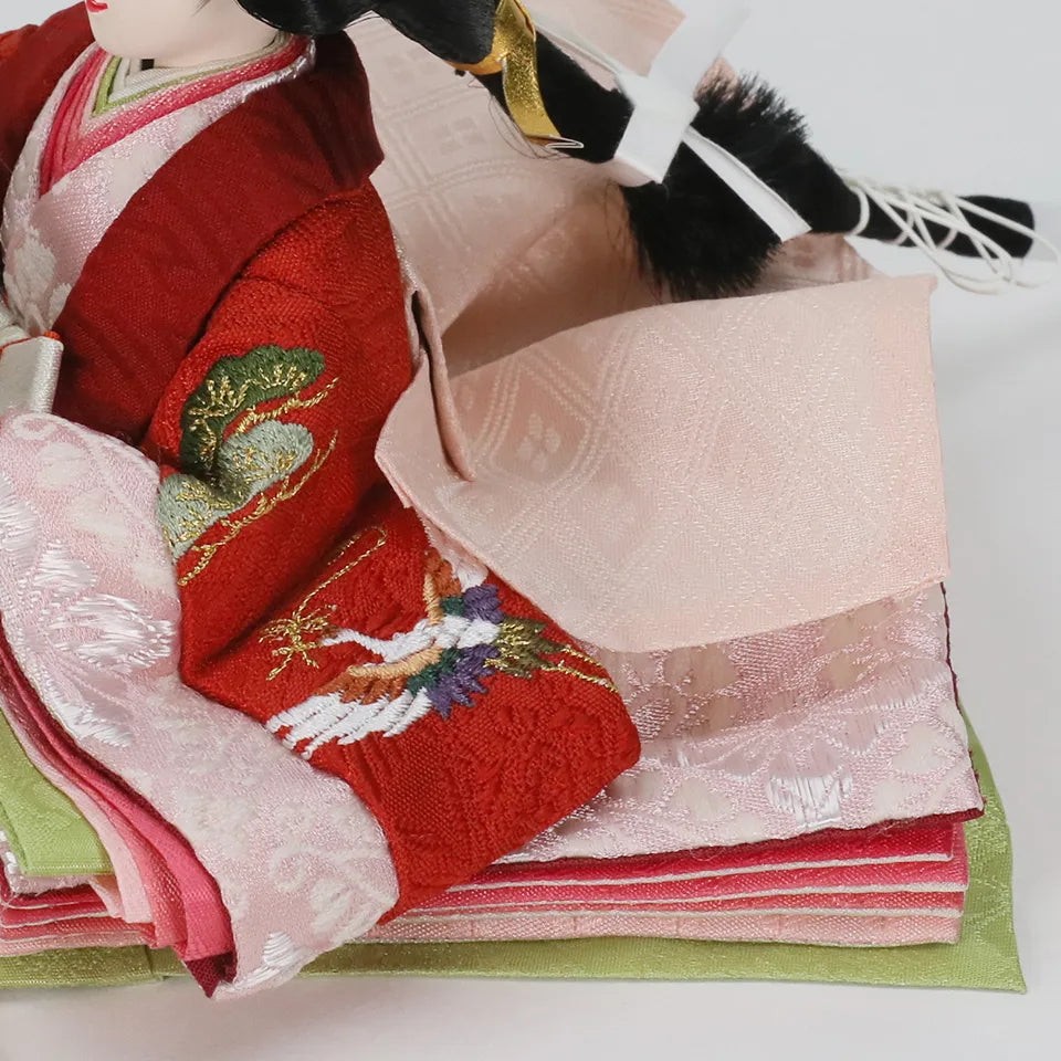 "子は宝"という想いを込めた横手人形のオリジナル雛人形「子宝雛」。着物に刺繍されている金の糸には、お子様に訪れる多くの幸せを表し、鶴はご家族のみなさんであり、将来出会う人々や経験を表現しています。お子様の人生を見守り、育てる雛人形を丹精込めてつくりあげました。