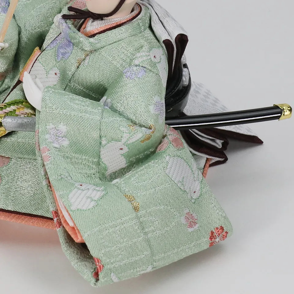 衣装の柄には月の使いとも言われ「ツキを呼ぶ」縁起の良い動物、「うさぎ」が使われています。うさぎの長い耳は福を集めると言われ、「子宝印」の鶴が運ぶ金の糸(幸せ)をうさぎのもつ長い耳で集めて、穏やかなお子様に成長してほしいという願いを込めています。