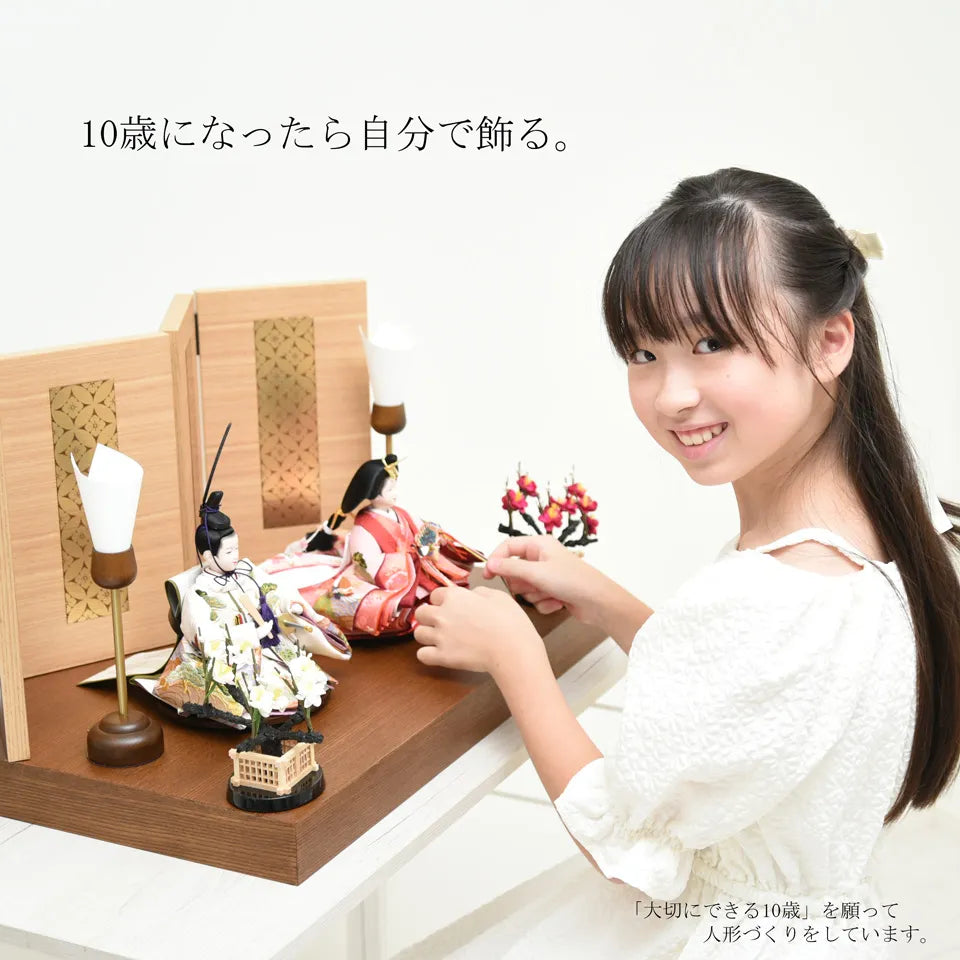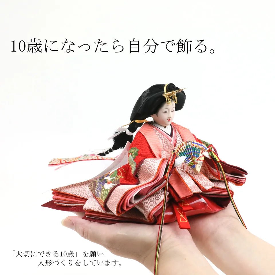 "子は宝"という想いを込めた横手人形のオリジナル雛人形「子宝雛」。着物に刺繍されている金の糸には、お子様に訪れる多くの幸せを表し、鶴はご家族のみなさんであり、将来出会う人々や経験を表現しています。お子様の人生を見守り、育てる雛人形を丹精込めてつくりあげました。