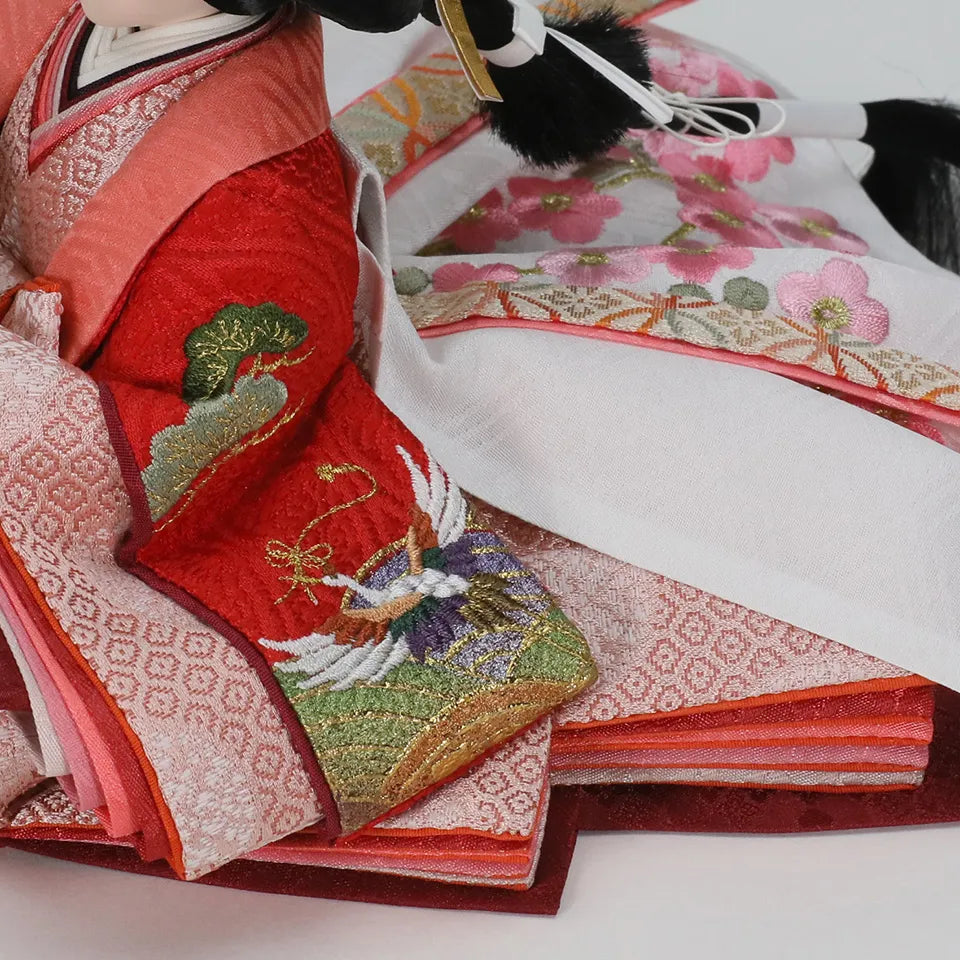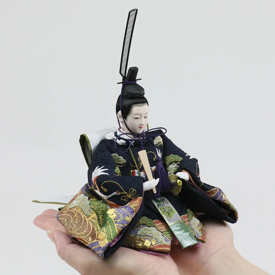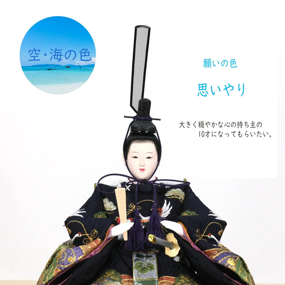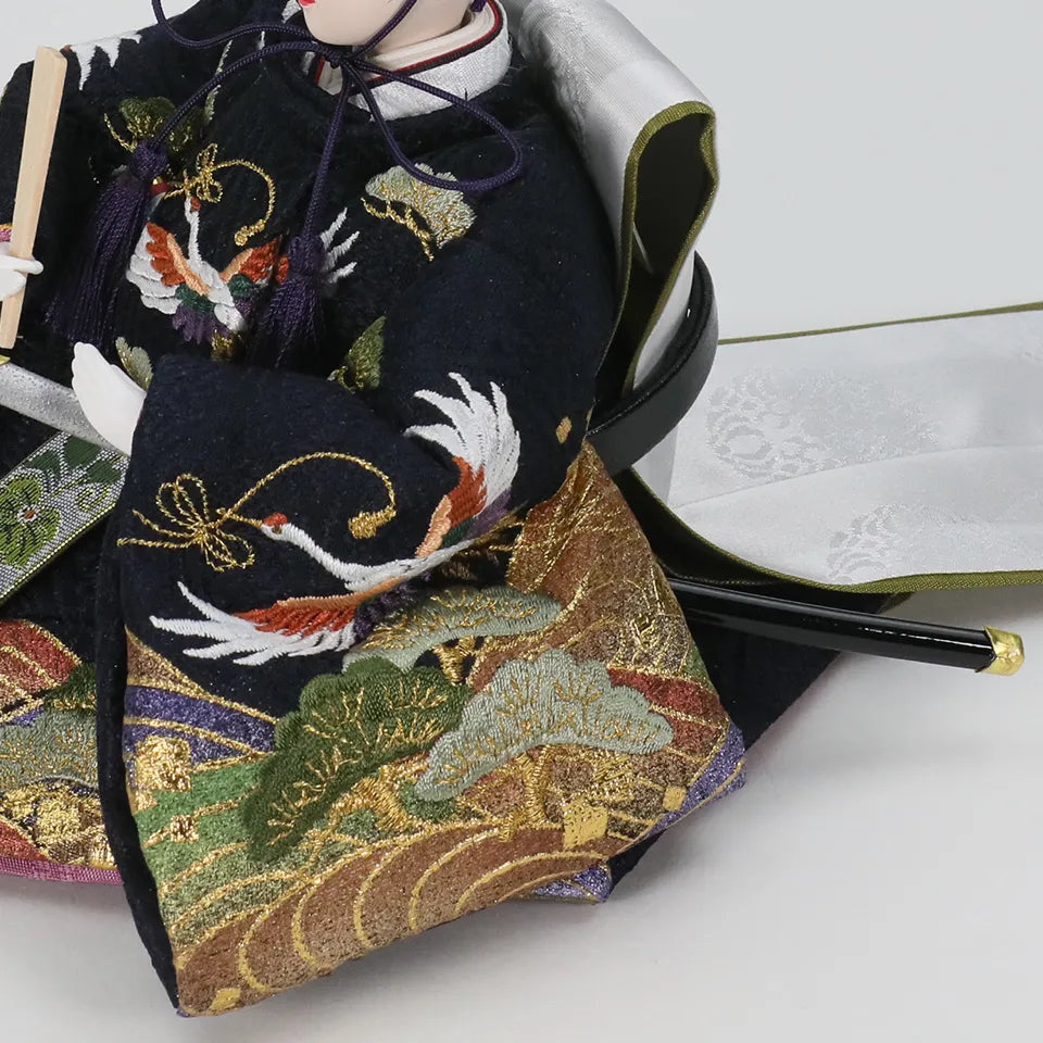 衣装:紺と赤の立枠柄の生地に子宝印が刺繍され、日本の伝統の配色で厳かな雛人形を仕立てました。