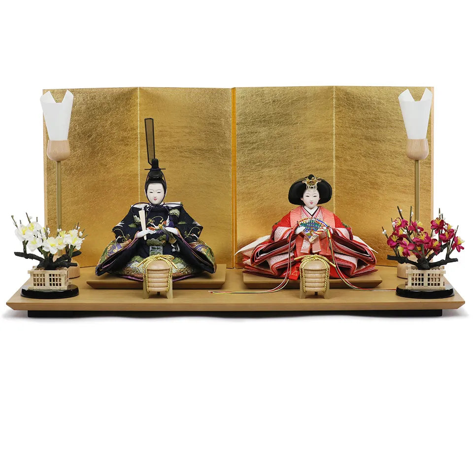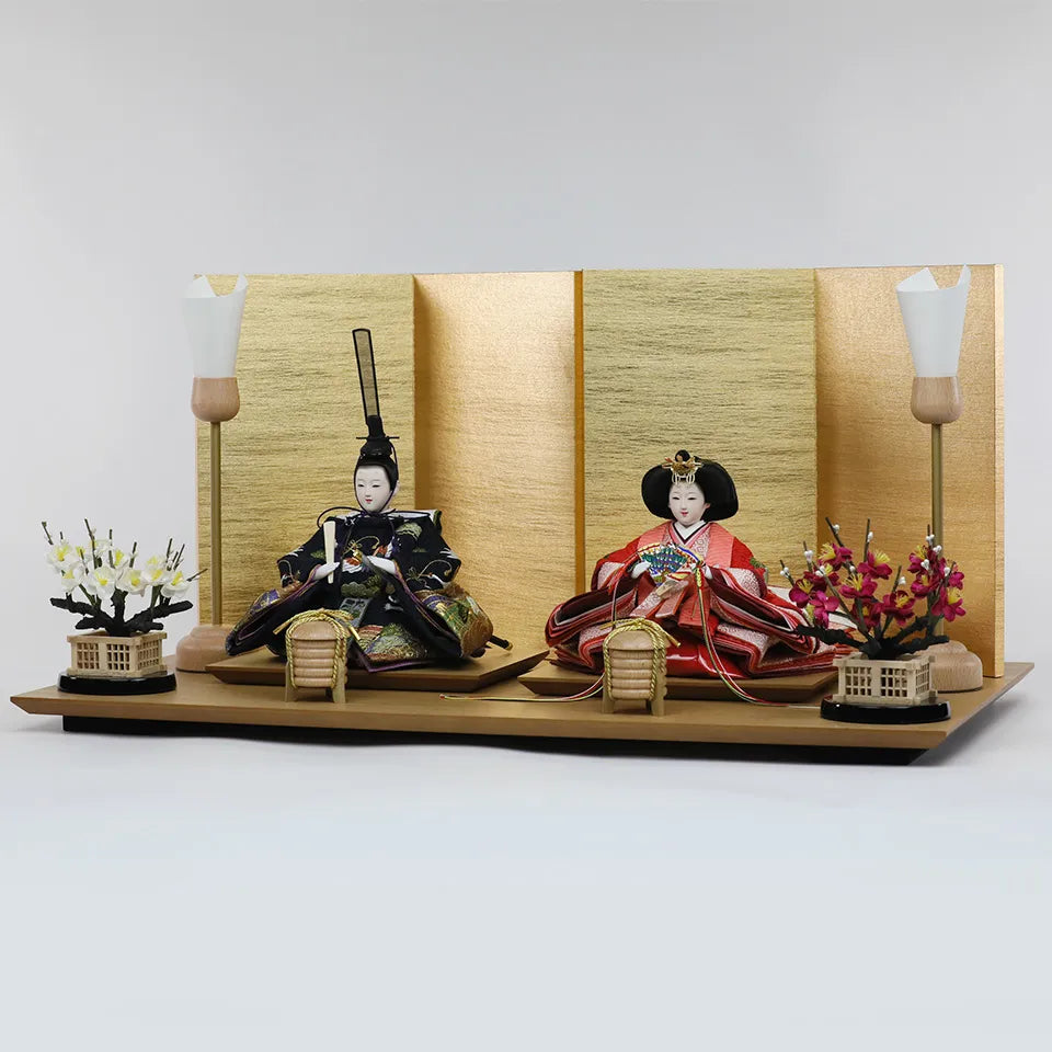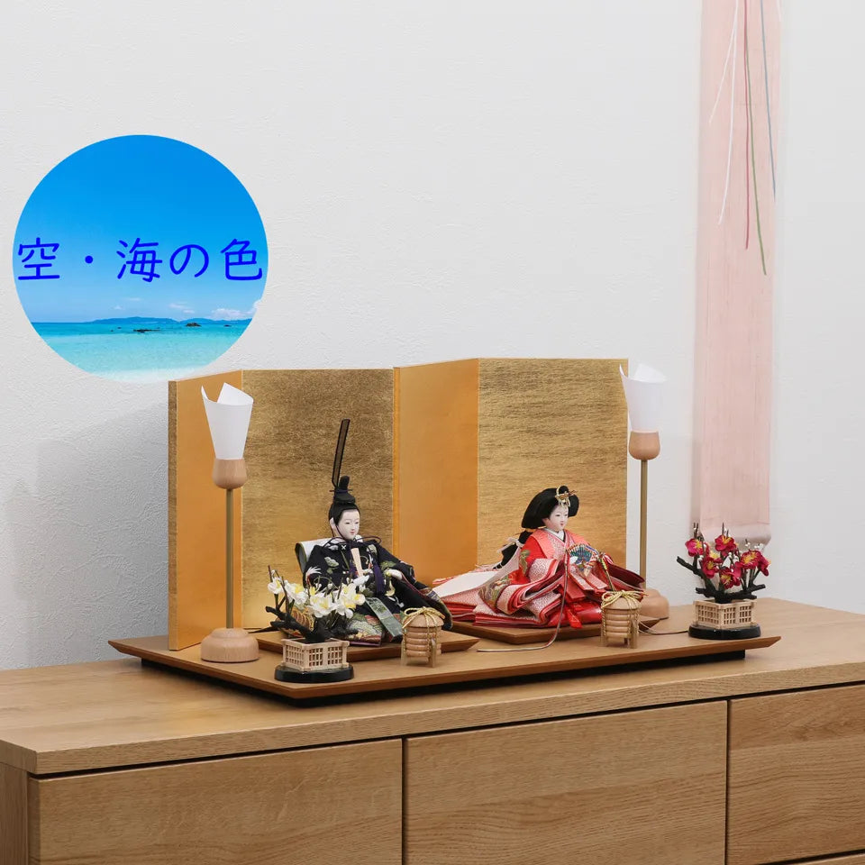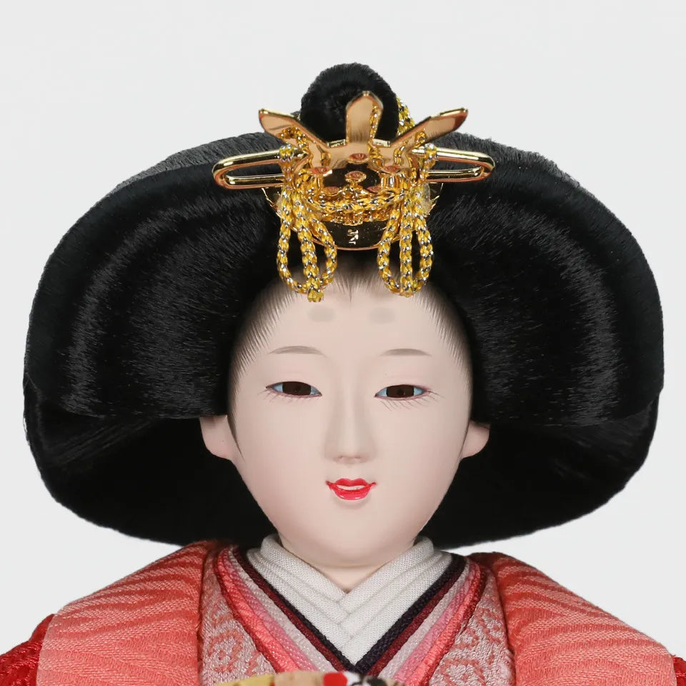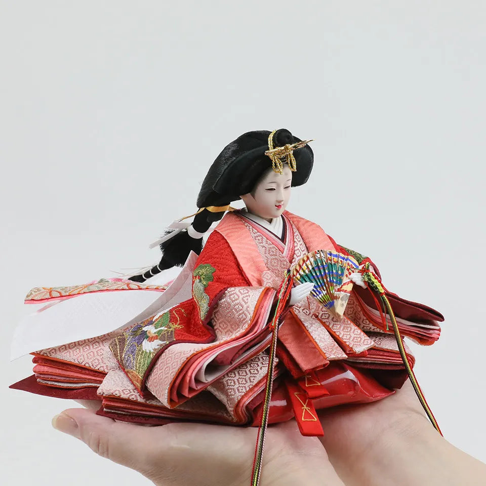 衣装:紺と赤の立枠柄の生地に子宝印が刺繍され、日本の伝統の配色で厳かな雛人形を仕立てました。